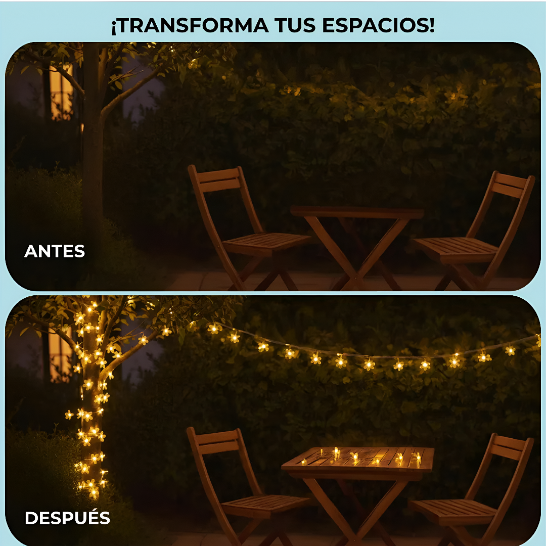 Decora tu exterior con 30/50 luces LED en forma de flor/estrellas, cargadas con energía solar y listas para brillar cada noche.